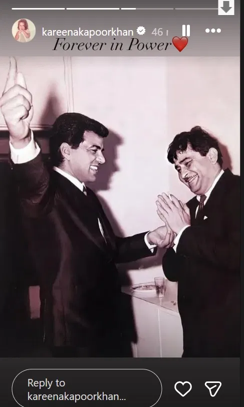 धर्मेंद्र के निधन की खबर से इंडस्ट्री में शोक की लहर दौड़ गई है। कई सितारे अंतिम संस्कार में शामिल होने पहुंचे हैं। वहीं कुछ सोशल मीडिया पोस्ट के जरिए हीमैन को श्रद्धांजलि दे रहे हैं। करीना कपूर ने धर्मेंद्र और अपने दादा राज कपूर की एक थ्रोबैक फोटो शेयर करते हुए लिखा है, ‘हमेशा पावर में रहने वाले दिग्गज’।